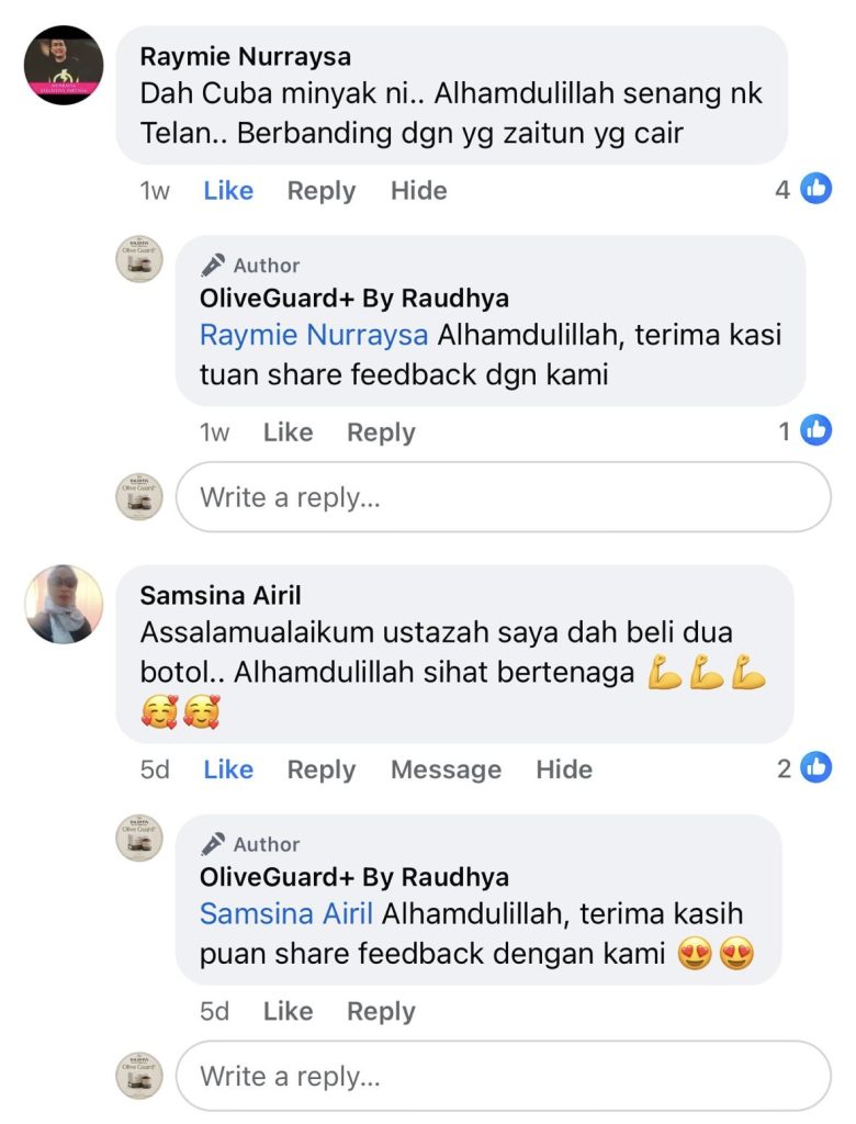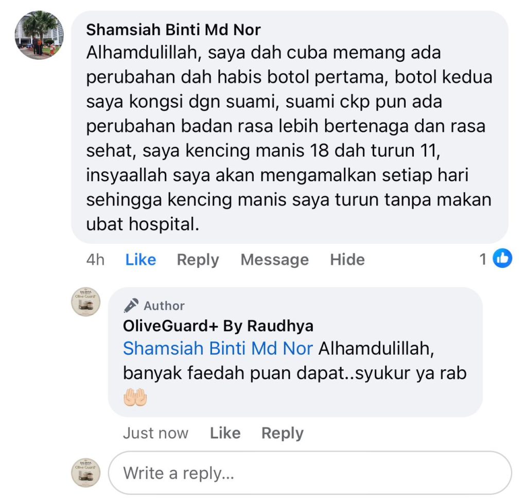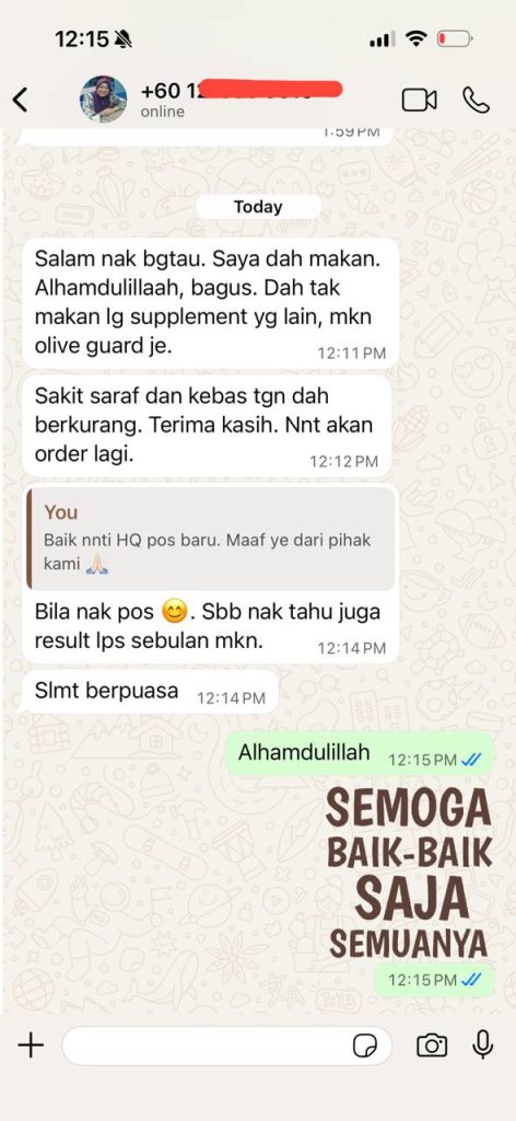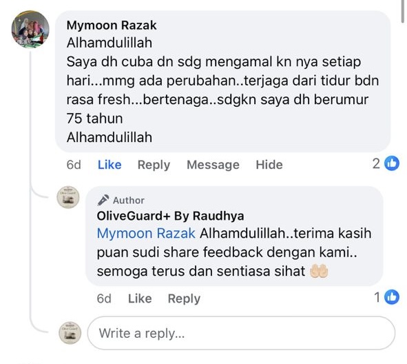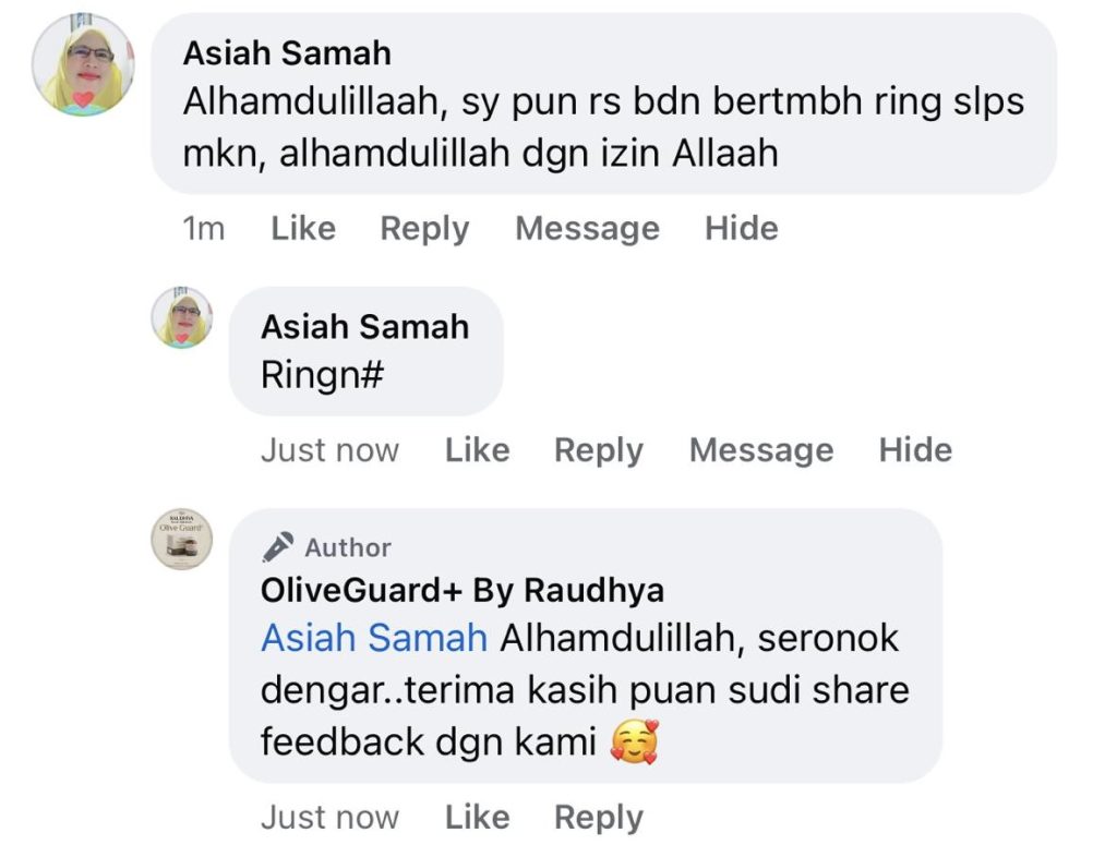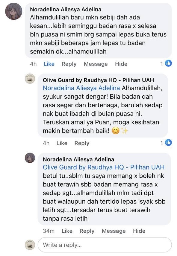"Baru hari ke-3 dah dapat rasa kesan baik Olive Guard+. Sakit-sakit badan kurang, badan makin bertenaga."