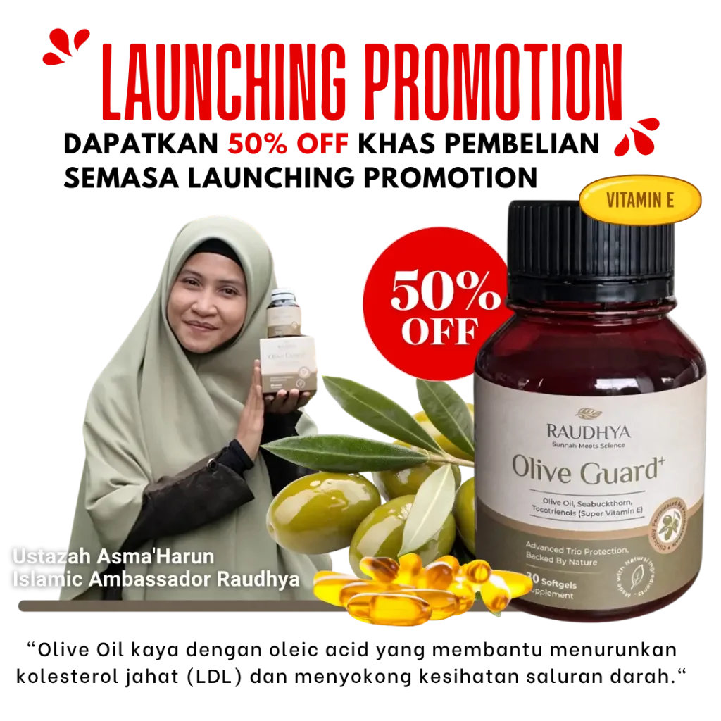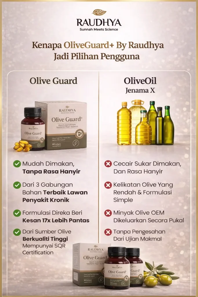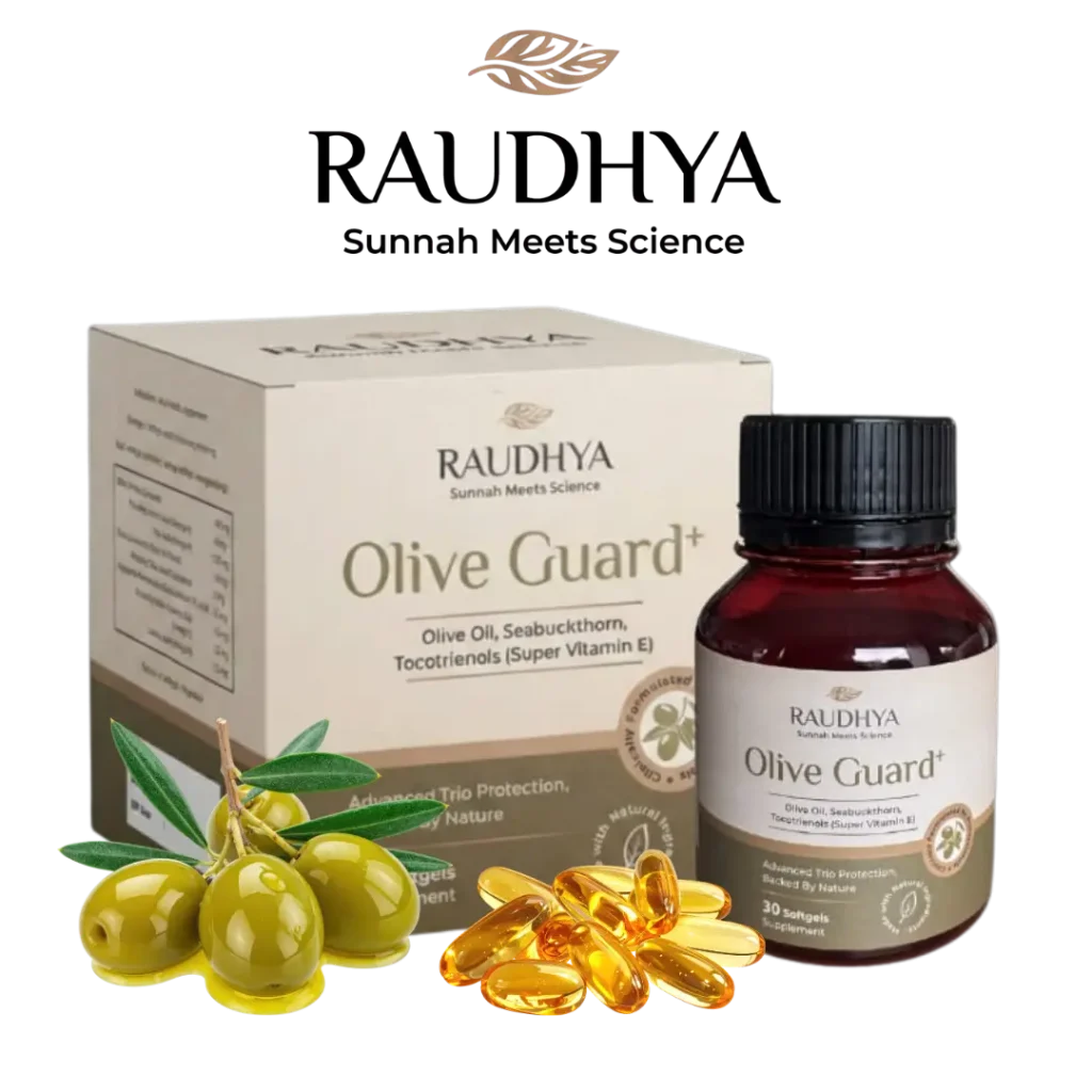 Raudhya OliveGuard+ Diperkaya Bahan Aktif Polyphenols, Tocotrienols (Super Vitamin E) & Omega Aktif Menyokong Kawalan Gula, Kolesterol & Tekanan Darah